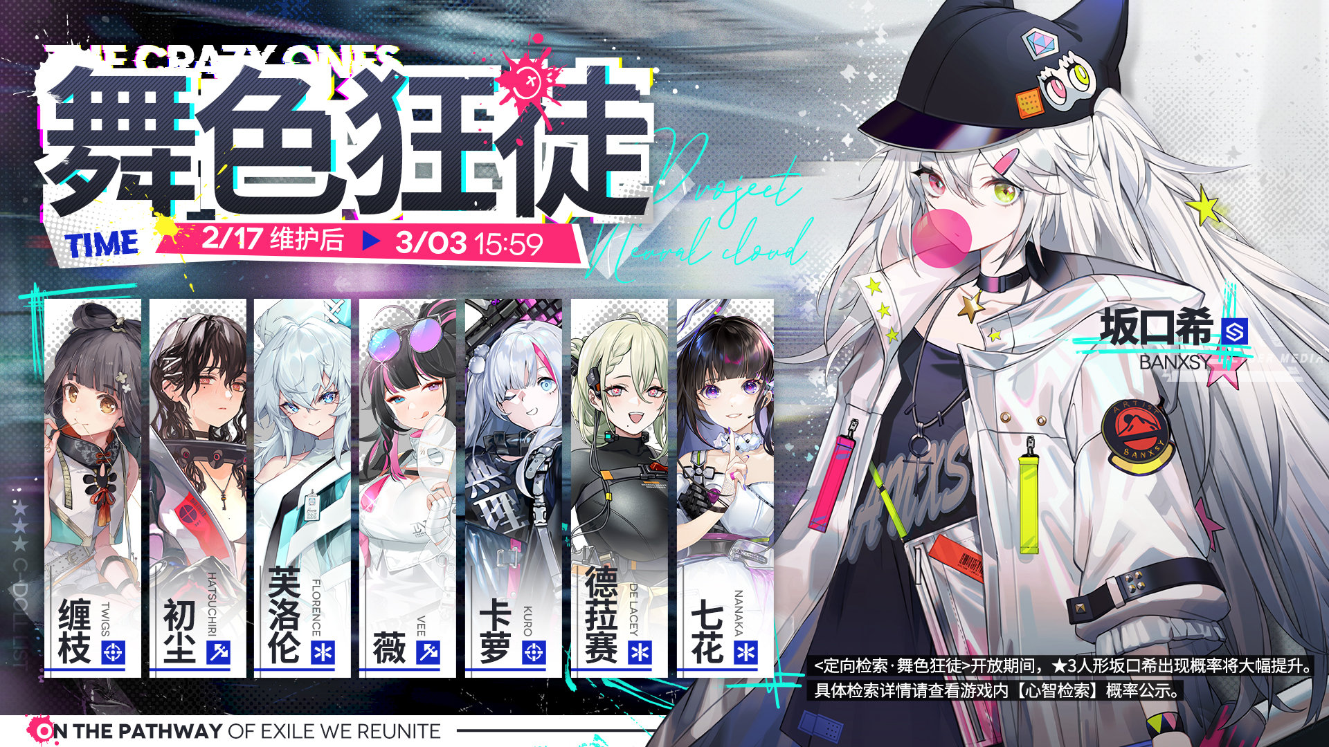 2月17日维护后~3月3日 15:59期间,定向检索·舞色狂徒将限时开放!开放期间,三星人形坂口希出现概率将大幅提升。