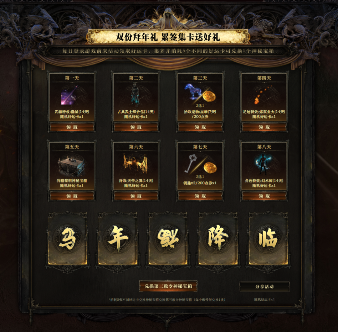 活动介绍:活动期间,流放者每日登录游戏并在登录当天前来活动页面可轻松领取对应奖励和随机好运卡,累计签到五天可领取1个狩猎黎明神秘宝箱!分享活动也可获得1张随机好运卡,集齐五张不同字符的好运卡后点击"兑第三敕令神秘宝箱"将消耗五张不同的好运卡兑换1个第三敕令神秘宝箱!