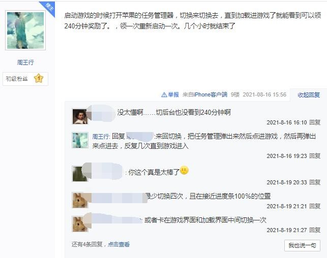 启动游戏的时候打开苹果的任务管理器,切换来切换去,直到加载进游戏了就能看到可以领240分钟奖励了。