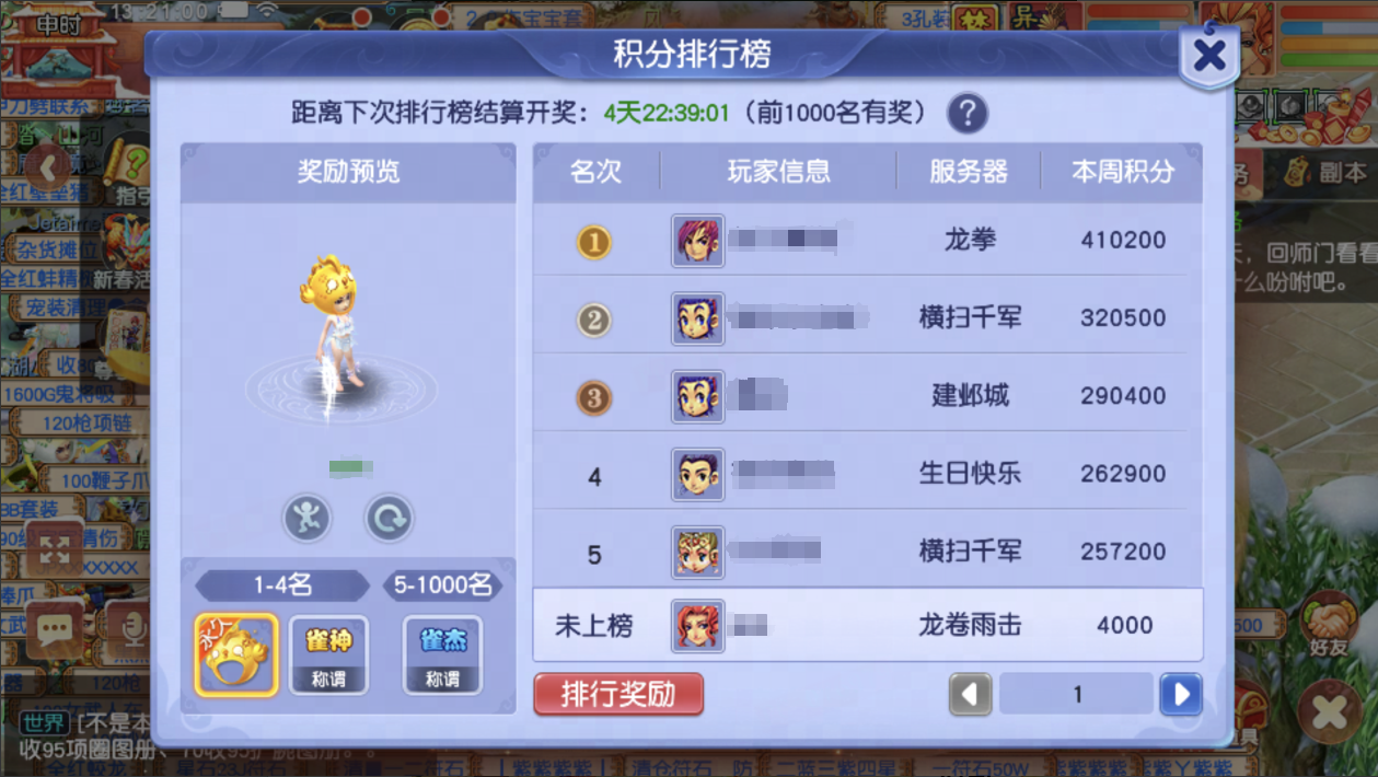 少侠若是赢了还能获得雀神积分,每周积分排行1-4名的少侠可以获得永久黄金幺鸡头套和特色限时称谓“雀神”。