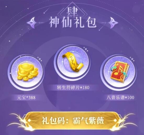含元宝x388、转生符碎片x180、八音乐谱x100,有效期至8月31日