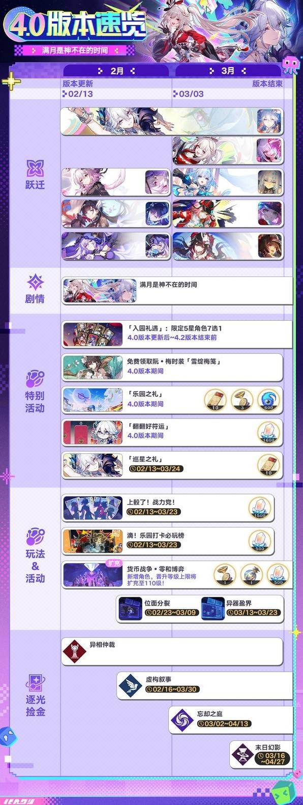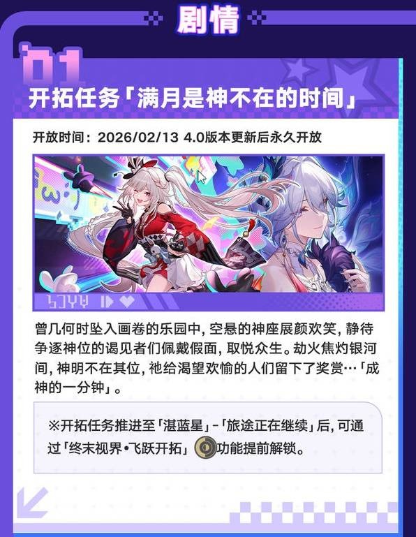 崩坏星穹铁道4.0版本[满月是神不在的时间]在2月13日正式上线,全新活动跃迁、登陆特别活动也同步实装。作为大版本的4.0版本将为玩家带来海量的更新内容,那么下面就让小编带大家看看4.0版本更新的详细内容吧。