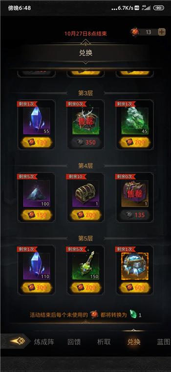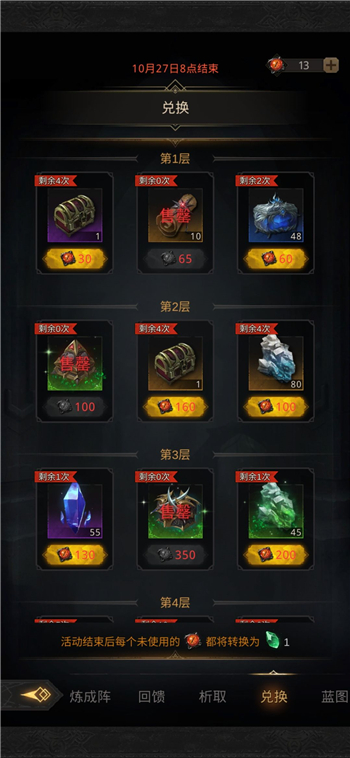 炼成阵产出规则是必须兑换完上一层,才能兑换下一层