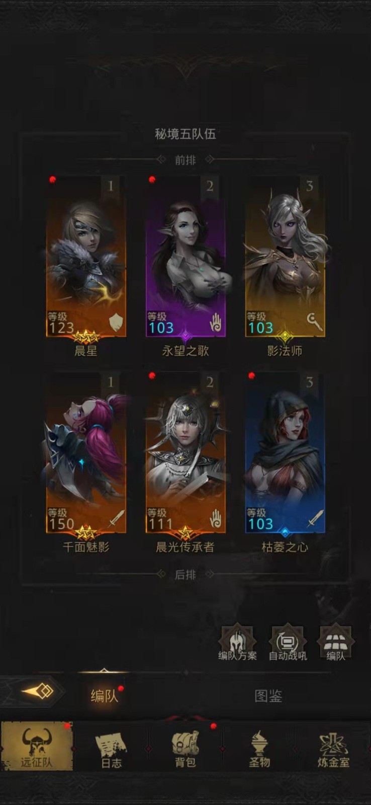晨星(主体)、千面(主C)、永望、晨光、枯萎之心(必带,30关小boss专用)、影法师(副C,随意一个都可以)