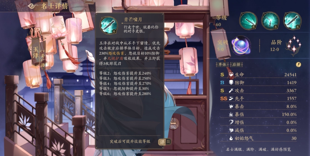 行走于世,就要比你的对手更狠。玉泽在对战中从不手下留情,优先攻击敌方后排单体目标,造成攻击230%怒攻伤害,忽视目标10%防御并无视护盾吸收效果,并立即获得3枚琼花刃