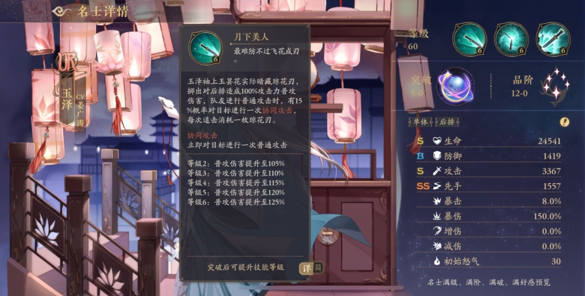 最难防不过飞花成刃玉泽袖上玉昙花实际暗藏琼花刃,掷出对后排造成100%攻击力普攻伤害,队友进行普通攻击时,有15%概率对目标进行一次协同攻击,每次追击消耗一枚琼花刃。