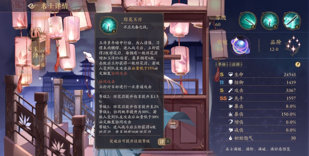 不应无备之战。玉泽多年暗中行动,为人谨慎,习惯未雨绸缪。进入战斗后,立即获得2枚琼花刃,每拥有一枚琼花刃增加玉泽1%伤害,最多拥有6枚,击败后立即获得一枚琼花刃。若敌人受到队友攻击后血量低于15%必定触发协同攻击
