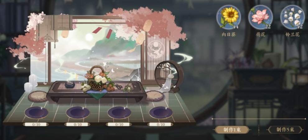 2、获得花朵后前往插花页面,在四个盘子中放入花朵,即可进行插花。每放入一类花朵需要消耗10朵花,根据不同的花朵组合,可以解锁出不同的插花成品道具;