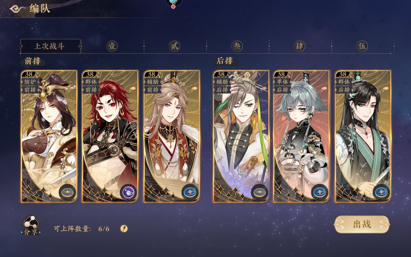 开服第七天,这是我目前的阵容,已经确定好的角色有小安,耶律,宣连隐,桃山。剩下两个待定。