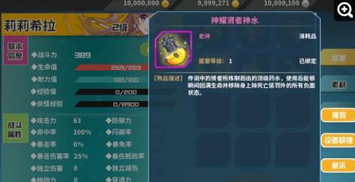 贤者神水:贤者神水分为神耀、高级、初级三种,使用后能瞬间回复一定生命值,以及移除身上除死亡惩罚外的所有负面状态。
