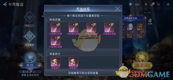 开启至尊魔盒有较大的概率获得,紫、粉色30~50级的+9~+13的高强化武器,并且开启至尊魔盒所获得的异化石,也是武器装备异化的必须材料,同时掉落的装备碎片可以换取55级的神圣橙装。艾米酱建议玩家们先氪先得,提前享受。合理的将每一笔投入掰开多份,花在刀刃上也是明智的选择。小tips:至尊魔盒也会掉落无色、玉牌、碎片等装备进化材料哦!
