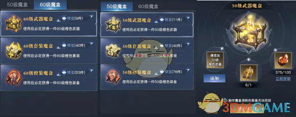 魔盒玩法是为了帮助玩家们以物换物而设计的,玩家再获得其他职业的装备或武器后可以通过魔盒,将其转换成自己职业能使用的装备。玩家获得50级的其他职业橙武后,可当做进化真武的材料,毕竟玩一次魔盒的成本也不低。同样50级橙装的爆率和获取方式有很多。建议有财力的玩家玩60级的魔盒!