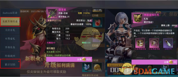 升级特惠和累计登录三天送的35级粉武和35级粉戒子、30级粉项链不管是氪金党还是白嫖党都是该阶段的毕业极品装备。因此,艾米酱建议在20~39级这个阶段,没必要浪费太多的资源在装备上,我们的策划大大都把极品装备送到咱手上了(^o^)/~!