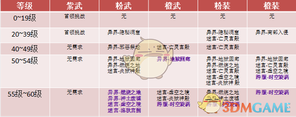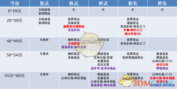在20~39级这个阶段,依然是快速升级的新手过渡期,月卡玩家基本在进服的第三天就会突破40级,因此,玩家们拥有一把高伤害的粉武并搭配蓝、紫装快速过渡即可。