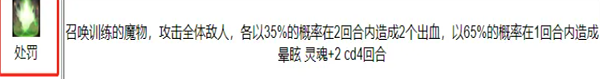 召唤训练的魔物,攻击全体敌人,各以35%的概率在2回合内造成2个出血,以65%的概率在1回合内造成晕眩 灵魂+2 cd4回合。
