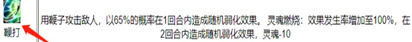 用鞭子攻击敌人,以65%的概率在1回合内造成随机弱化效果。 灵魂燃烧:效果发生率增加至100%,在2回合内造成随机弱化效果,灵魂-10;