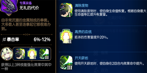 连击敌人,有60%的概率在1回合内造成防御力降低70%。根据自身最大生命值等比提升伤害量。