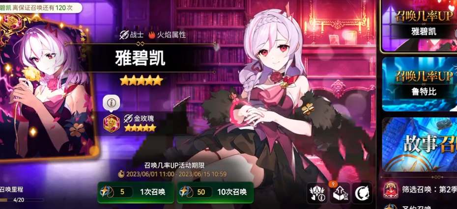 1、雅碧凯是五星的火属性战士,她的1技能有概率提供拉条,2技能对后排角色有守护的效果,且还能在战斗回合开始的时候为敌人附加诅咒效果;