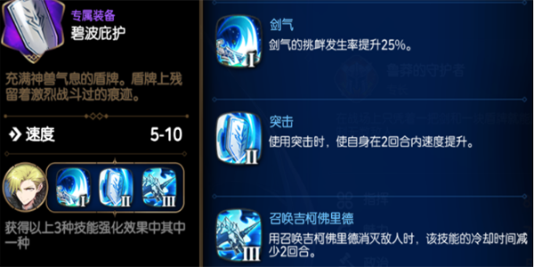 用盾牌推开敌人,使其速攻值降低35%后,使全体我军人员在2回合内防御力提升,根据自身最大生命值等比提升伤害量;
