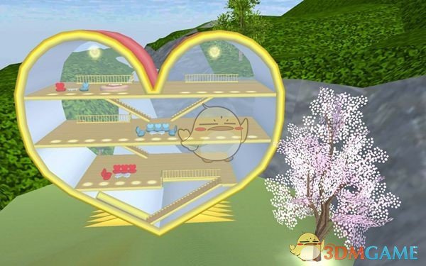 3、继续朝着哦粉红色的建筑飞行,飞到顶之后我们就可以看见爱心小屋的全貌。