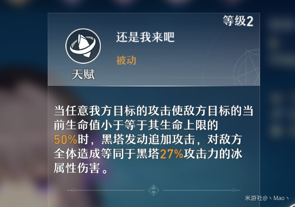 而当回合内有X只怪物血量降低到50%时,黑塔的转圈圈一次会造成Xhit的全体伤害