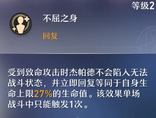 受到致命攻击时杰帕德不会陷入无法战斗状态,并立即回复等同于自身生命上限25%/27%/30%/32%/35%/37%的生命值。该效果单场战斗中只能触发1次。