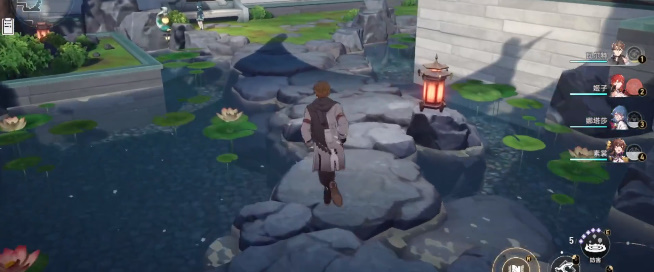 4、玩家视角往后面转,一直走再左转,穿过一片荷塘,笔直走,然后上楼梯,在楼梯的右侧的角落里就是机巧鸟的位置;