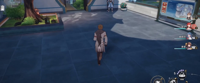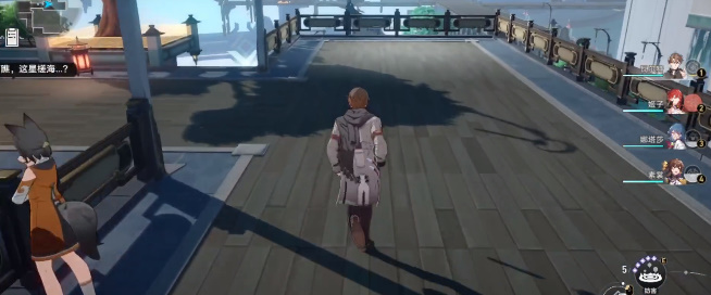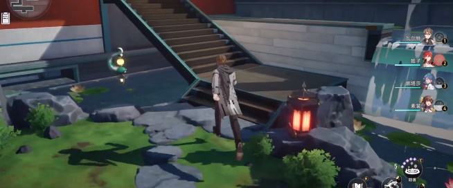 3、玩家一直往桥的前面走,然后在往左边拐,接着在笔直走,在楼梯的旁边可以看到梓桥站在那里;
