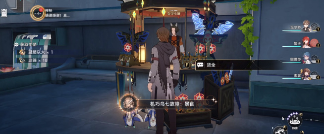 1、首先传送到星槎海中枢下图这个位置,到达之后在一个卖货的地方可以看到一个不满的小鸟,上前跟他对话;
