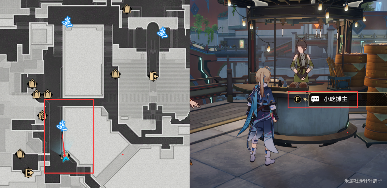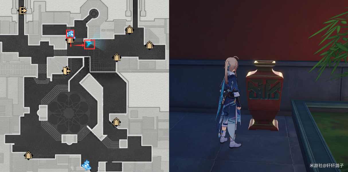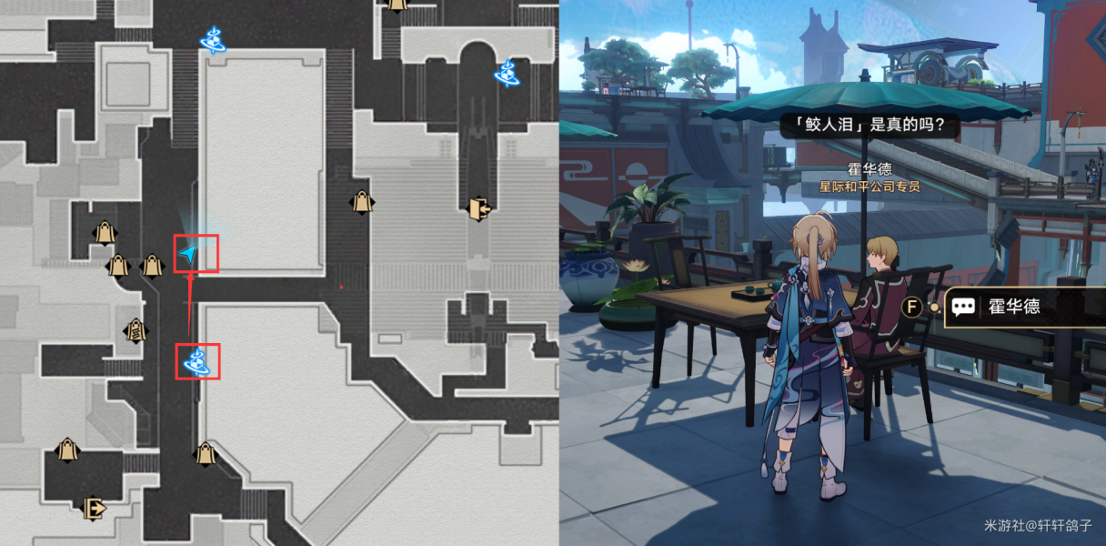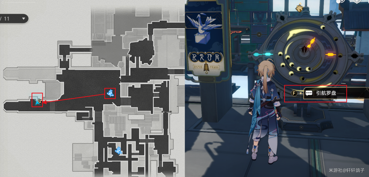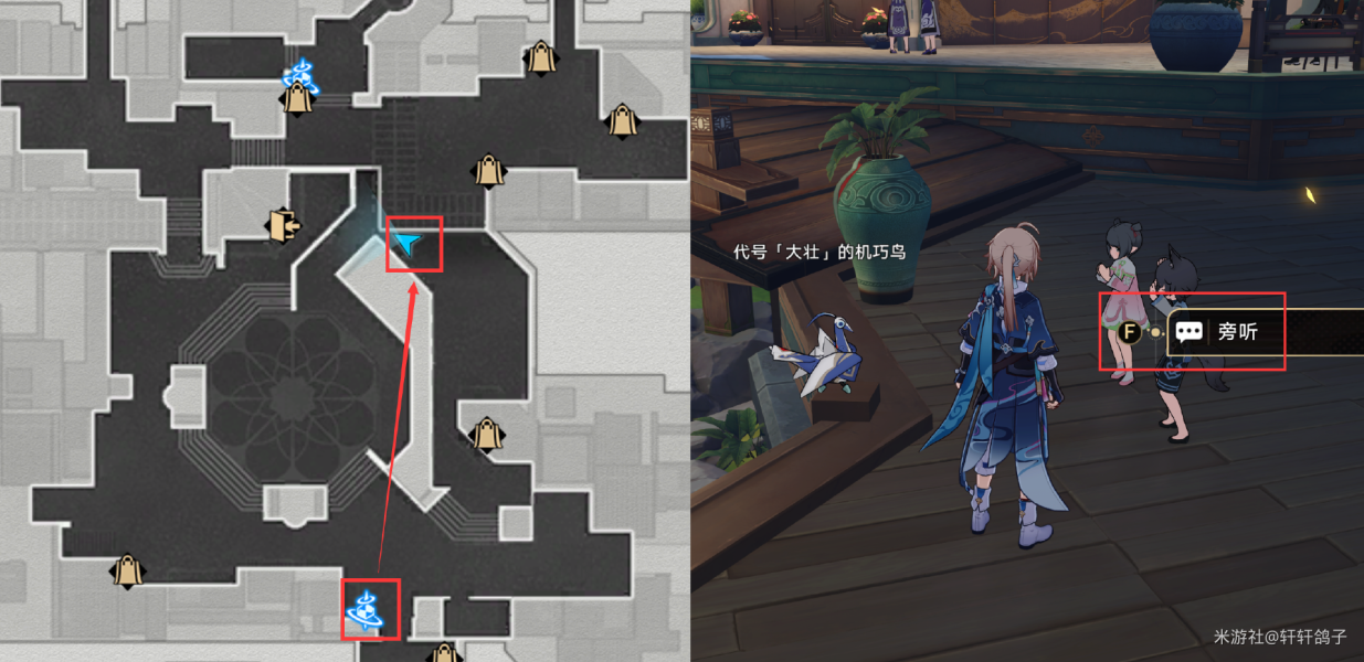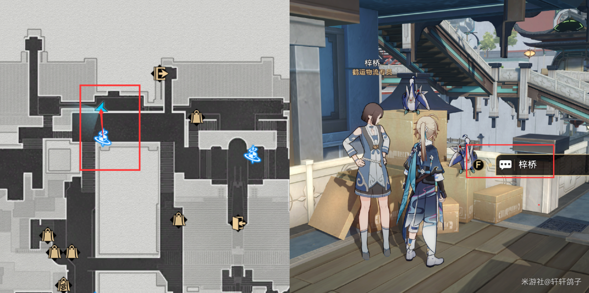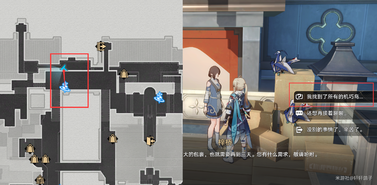 1)来到星槎海中枢如图所示的位置,与忧郁的机巧鸟对话。得到提示:寻找梓桥。