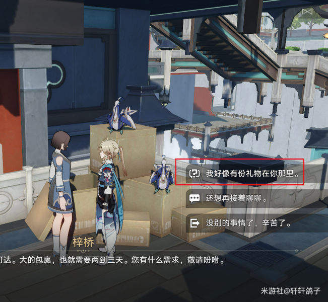 第二天第三次会出现一个女人给一个取货码,提示找梓桥。顺带一提别急着回去,还能再转一次罗盘。梓桥在如图所示的位置,选择【我要取个货】。可获得巡镝。
