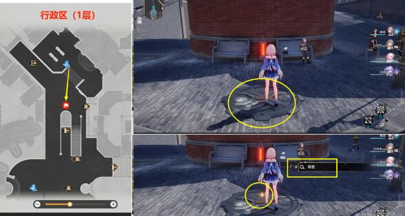 (1)去下图【行政区(1层)】位置,在这个【井盖】上站一会后,【井盖】上就会出现一个发光【调查点】,【调查】后,即可获得20冬城盾