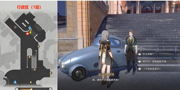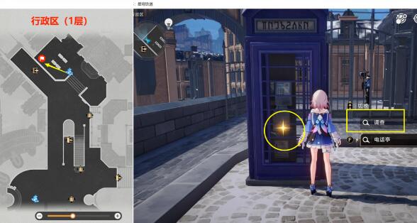 (1)首先去下图【行政区(1层)】位置,在【电话亭】发光点这里【调查】一下,对完话后,获得20冬城盾