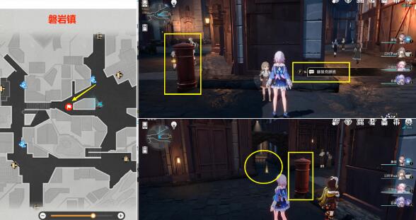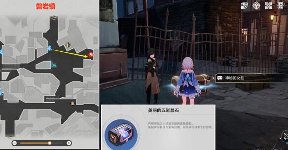 (1)首先去下图【磐岩镇】位置,与【神秘的女性】一直对话,将她旁边的2个宝箱都开了之后,即可获得20冬城盾+1个【美丽的五彩晶石】