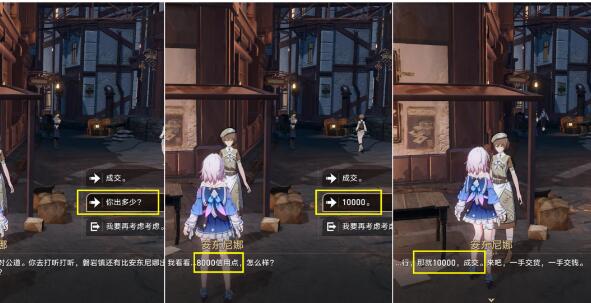 (5)另外说下,就是最后这里,大家卖给她的时候,先不要直接选择【成交】,先选择【你出多少?】,然后她会说8千信用点,这时们再选择1万信用点,她就会说,1万也可以,所以大家不要直接选择【成交】,不然你获得就是20冬城盾+8千信用点,和她讨价还价后,你获得就是20冬城盾+1万信用点