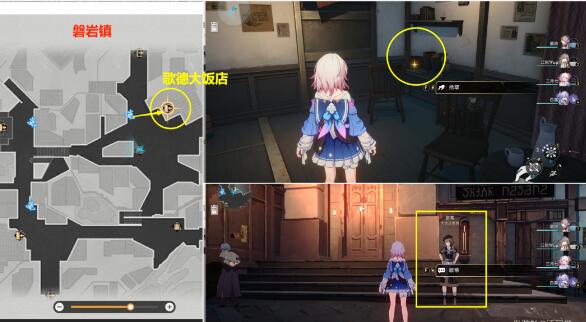 (1)首先去下图【磐岩镇】的【歌德大饭店】(廉价房间)里面,在桌子上的发光点处【调查】,就是填写一份【服务评价】