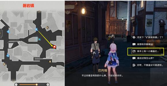(2)然后来再下图【磐岩镇】位置,与【矿灯巴列维】对话选择【我手上有一小撮晶石】,然后将晶石卖给他后,还可获得1个【崇高道德的赞许】+1万信用点