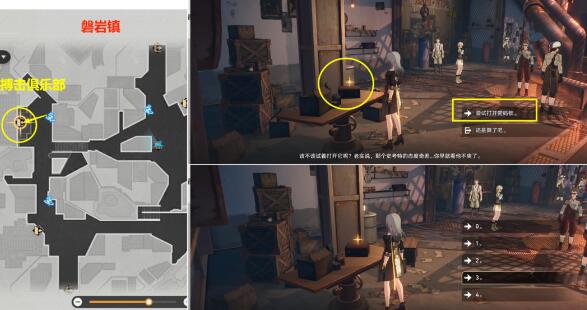 (3)最后再去下图【磐岩镇】的【搏击俱乐部】里面,进门左边桌子上,箱子发光点【调查】后,选择【尝试打开密码锁】,然后依次选择密码【0213】开锁后,即可再获得20冬城盾