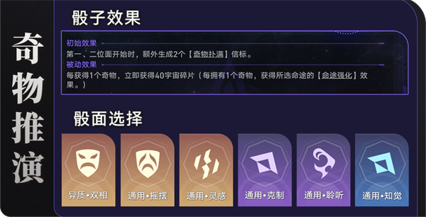 2、之后会进行奇物推演,骰子分别有:[异质·双相]、[通用·摇摆]、[通用·灵感]、[通用·克制]、[通用·聆听]、[通用·知觉]。
