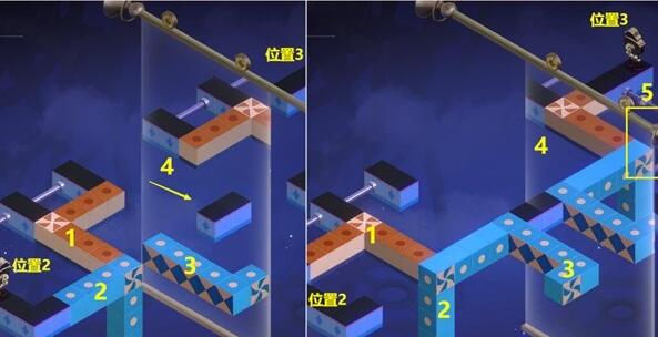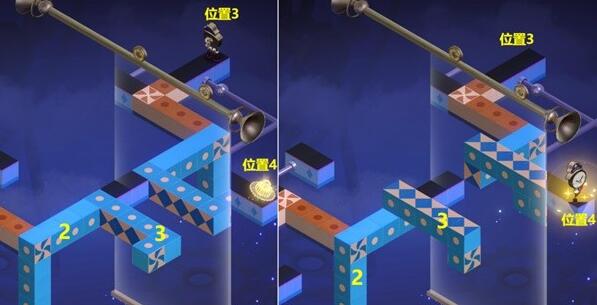 (9)将2蓝色模块要先点2次,让它去旋转2次,【钟表小子】会从位置3到位置4,然后就可以过关了。