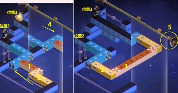 (6)将2黄色模块移动到下图位置,【钟表小子】会从位置2到位置3,按照这个方法的话就可以过关了。