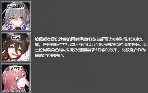 给佩戴者提供速度的同时释放终结技后可以为全队带来速度加成,是目前版本中为数不多可以为全队带来增益的遗器套装。此三位同谐角色均可以触发遗器套装4件套的效果,比较适合作为辅助定位的角色。