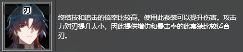 终结技和追击的倍率比较高,使用此套装可以提升伤害。攻击力对刃提升太小,因此提供增伤和暴击率的此套装比较适合刃。