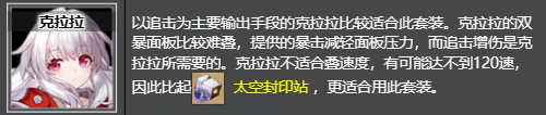以追击为主要输出手段的克拉拉比较适合此套装。克拉拉的双暴面板比较难叠,提供的暴击减轻面板压力,而追击增伤是克拉拉所需要的。克拉拉不适合叠速度,有可能达不到120速,因此比起太空封印站 ,更适合用此套装。