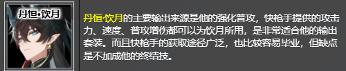 丹恒·饮月的主要输出来源是他的强化普攻,快枪手提供的攻击力、速度、普攻增伤都可以为饮月所用,是非常适合他的输出套装。而且快枪手的获取途径广泛,也比较容易毕业,但缺点是不加成他的终结技。