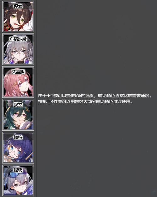 由于4件套可以提供6%的速度,辅助角色通常比较需要速度,快枪手4件套可以用来给大部分辅助角色过渡使用。