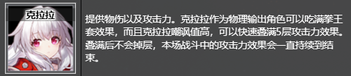 提供物伤以及攻击力。克拉拉作为物理输出角色可以吃满拳王套效果,而且克拉拉嘲讽值高,可以快速叠满5层攻击力效果。叠满后不会掉层,本场战斗中的攻击力效果会一直持续到结束。