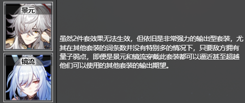 虽然2件套效果无法生效,但依旧是非常强力的输出型套装,尤其在其他套装的词条数并没有特别多的情况下,只要敌方拥有量子弱点,即便是景元和镜流穿戴此套装都可以逼近甚至超越他们可以使用的其他套装的输出期望。