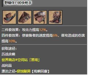 四件套效果:使装备者的速度提高6%,普攻造成的伤害提高10%。