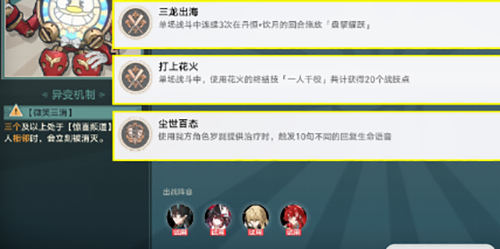 2、打上花火\三龙出海\全民欢乐秀\尘世百态:配队如下图所示,开启自动战斗,尘世百态成就把银枝换成其他角色就可以了。